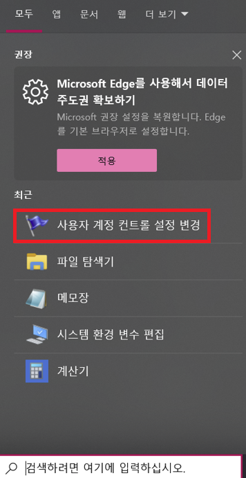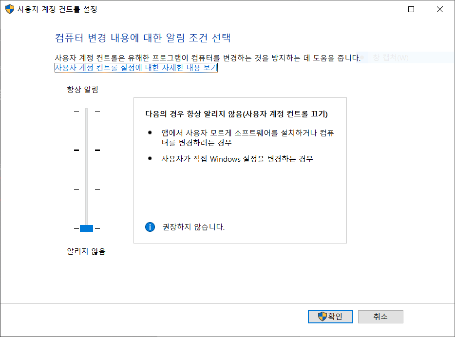 관리자 권한으로 프로그램을 실행하면 "사용자 계정 컨트롤 : 이 앱이 디바이스를 변경할 수 있도록 허용하시겠어요?" 창이 뜨는 걸 막기 위해 사용자 계정 컨트롤 설정 변경에 들어가서
