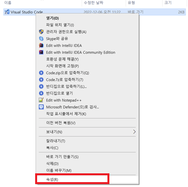 비주얼 스튜디오를 우클릭하고 속성으로 들어간다.