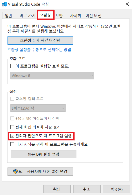 속성의 호환성 탭을 누른 뒤 '관리자 권한으로 이 프로그램 실행'을 눌러준 뒤 확인을 눌러준다.
