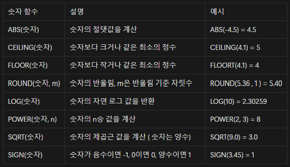 이번에는 SQL의 내장함수에 대해 알아보는 시간을 가져볼 것입니다. 수학에서 함수 y = f(x) 는 값 x를 함수 f에 넣으면 y값을 결과로 반환한다는 의미입니다.SQL 에서도 수학의 함수처럼 특정 값이나 열의 값을 입력받아 그 값을 계산하여 결과 값을 돌려주는 개념을 사용합니다.SQL 에서 사용하는 함수에는 DBMS가 제공하는 내장 함수와 사용자가 직접 만든 사용자 정의 함수가 있습니다. SQL 내장 함수는 다음과 같이 SELECT 절, WHERE 절, UPDATE 절 등에서 모두 사용할 수 있습니다.SELECT 함수명(인자1,인자2,인자3,...)FROM 테이블이름WHERE 열이름 = 함수명(인자1,인자2,인자3,...); UPDATE 테이블이름SET 열이름 = 함수명(인자1,인자2,인자3,...)..