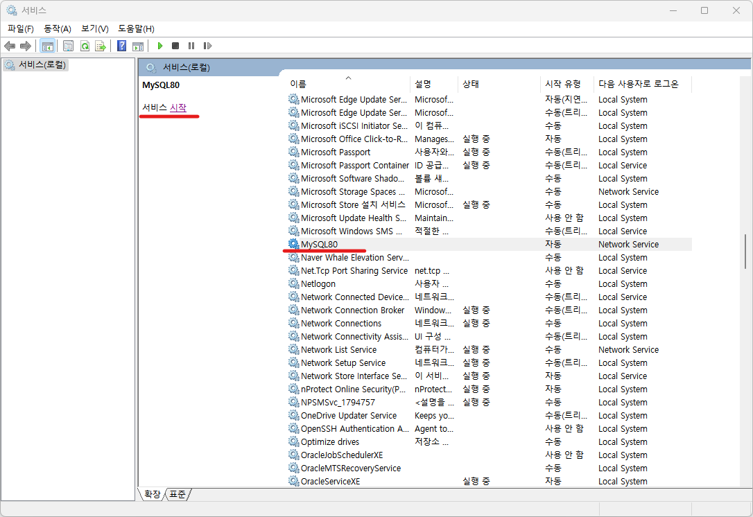 ERROR | MYSQL 접속 에러 / ERROR 2003 (HY000): Can't connect to MySQL server on 'localhost:' (10061) MySql root 계정에 접속하려는 도중. 분명 비밀번호를 맞게 입력했는데, 접속 에러가 발생해서 답답했었다. 해결방법 ) 서비스에 들어가서 ' MYSQL80 ' 을 찾은 후 실행을 해준다. 실행을 해줬더니!! 접속 성공했다~ error 2023.11.07