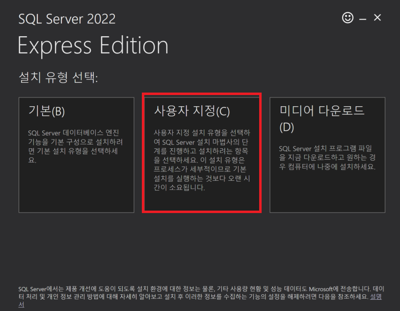 [MS-SQL] SQL Server 2022 설치하기 오늘은 SQL Server 2022 버전을 설치할 것이다. 다운로드는 아래 링크에서 하면된다.https://www.microsoft.com/ko-kr/sql-server/sql-server-downloads 여기서 Express 버전을 다운로드받는다.1. 설치파일 실행 2. 사용자 지정 선택 3. 언어 설정 및 설치 4. 새 SQL Server 독립 실행형 설치 또는 기존 설치에 기능 추가 및 동의 5. 설치 규칙 확인 후 다음 6. Azure 확장기능나는 그냥 해제가고 다음으로 넘어갔다. 7. 기능선택Machine Learning Services 및 언어 확장은 해제하고 다음으로 넘어갔다 8. 인스턴스 구성기존에 등록했던 인스턴스가 있기 때문에 TEST 인스턴스 생성 9. 서버 구성그냥 default로.. Database/MS-SQL 2024.06.13